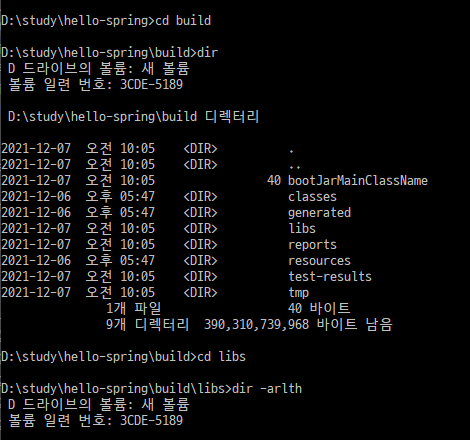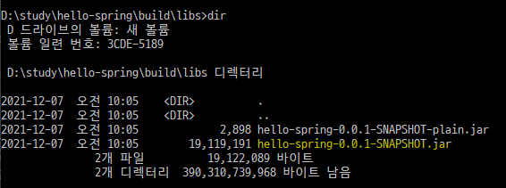 cd build/libs dir๋ก ํ์ผ ๋ชฉ๋ก์ ํ์ธํ๋ค.