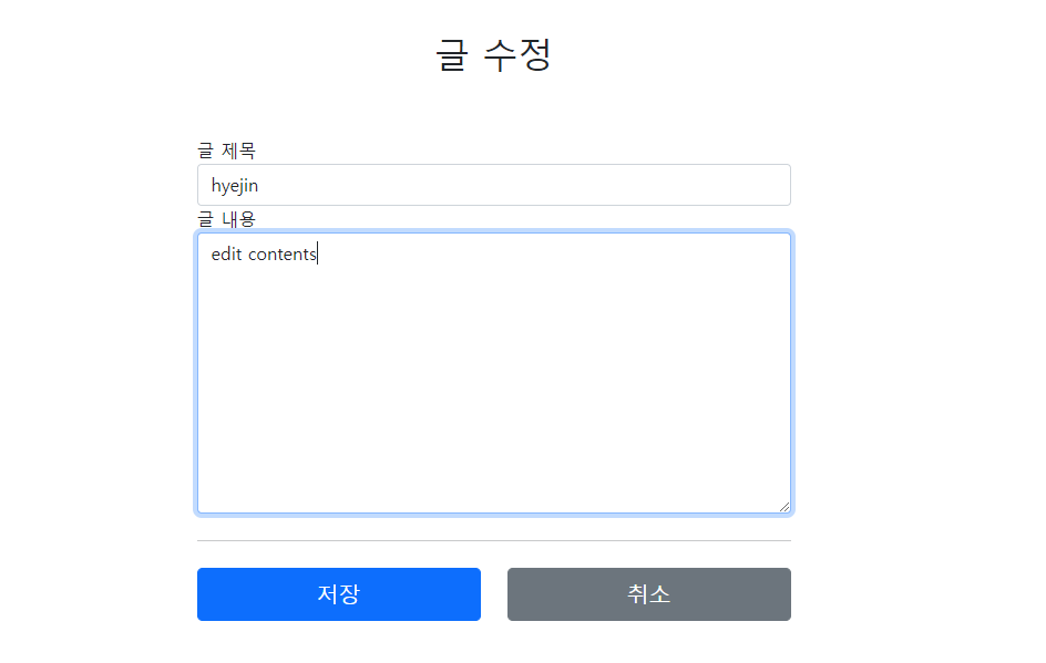 ๊ทธ๋ฆฌ๊ณ ์์  ํ์ด์ง์์ ์์  ๋ฒํผ์ ๋๋ฅด๋ฉด @PostMapping("/{uid}/edit")์ผ๋ก ํด๋น ํธ๋ค๋ฌ๊ฐ ๋์ํ๊ณ ํ์ด์ง์ ์ ๋ชฉ๊ณผ ๋ด์ฉ์ด ์์ ๋๋ค.
