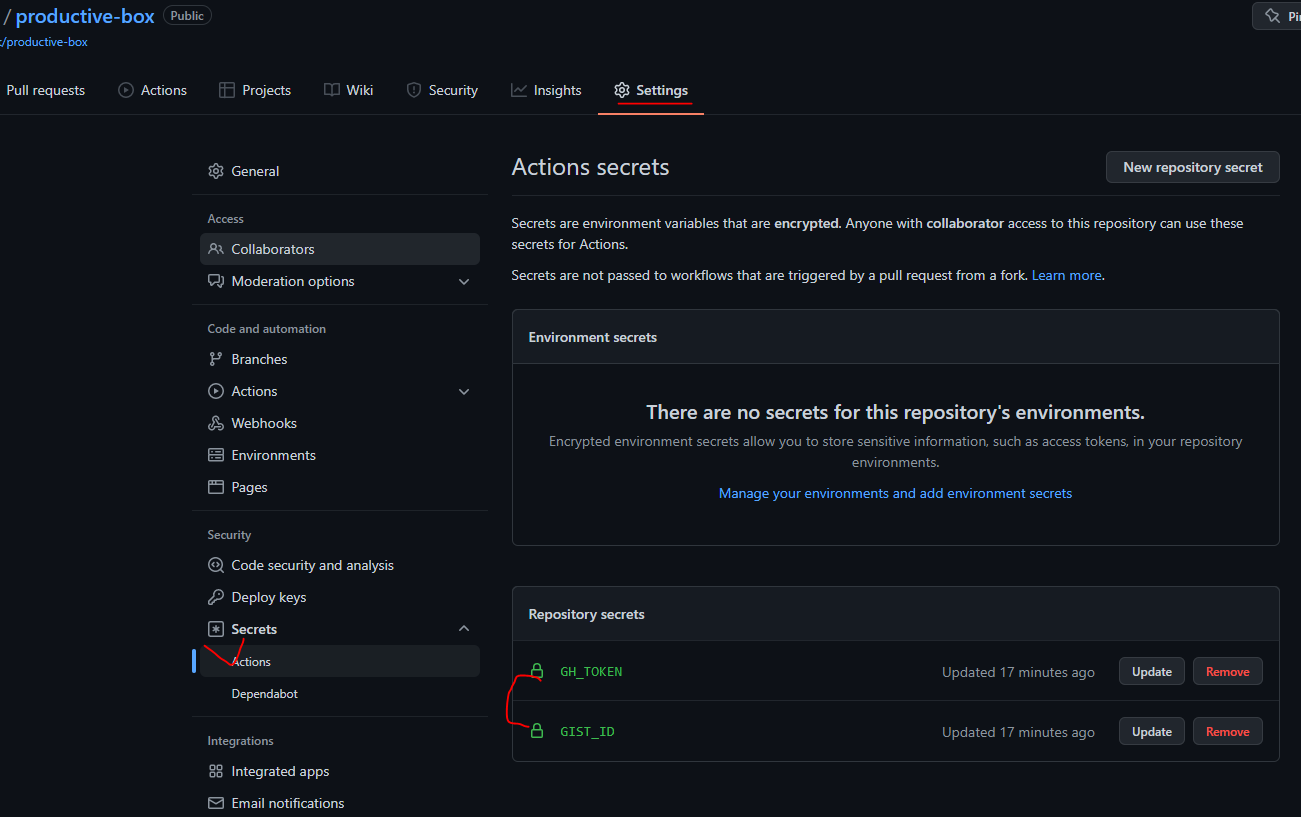GH_TOKEN์ ์๊น ์์ฑํ๋ ํ ํฐ๊ฐ์ ์ ๋ ฅํด์ ์์ฑํ๊ณ , GIST_ID ์ญ์ ๊ฐ์ ๋ฃ์ด ํ๊ฒฝ๋ณ์๋ฅผ ์์ฑํด์ค๋ค.