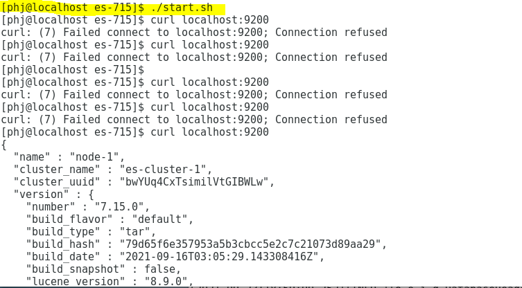 ./start.sh ํ๋ฉด elasticsearch๊ฐ ์คํ๋๊ณ , ์ข ๊ธฐ๋ค๋ฆฌ๊ณ curl localhost:9200ํด์ฃผ๋ฉด ์คํ๋๊ฑธ ํ์ธํ ์ ์๋ค.