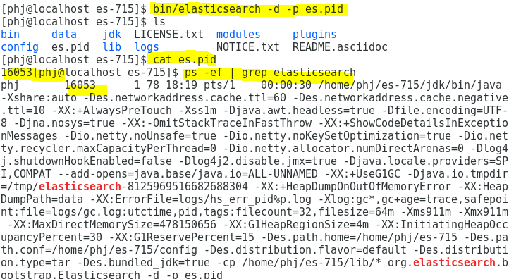 ์ด๋ฒ์ bin/elasticsearch -d -p es.pid๋ก ํ์ผ์ ๋ง๋ค์ด์ ์คํ