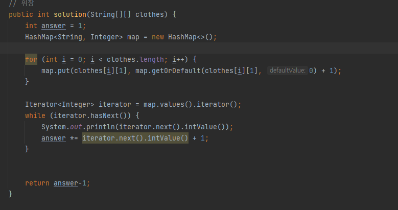 ํค๊ฐ clothes[i][1]์์ value๊ฐ์ ๊ตฌํ๊ณ ๊ฐ์ด ์์ผ๋ฉด ๊ธฐ๋ณธ๊ฐ 0 + 1 ์ด๊ณ ,