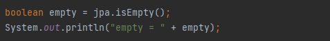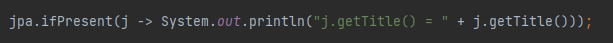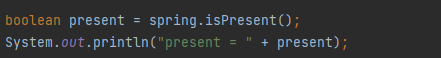 - isPresent() : ๊ฐ์ด ์กด์ฌํ๋์ง ํ์ธ, ์ ์ฅ๋ ๊ฐ์ด ์กด์ฌํ๋ฉด true๋ฅผ ๋ฐํ, ๊ฐ์ด ์กด์ฌํ์ง ์์ผ๋ฉด false๋ฅผ ๋ฐํ