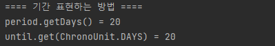 - ๊ธฐ๊ฐ์ ํํํ ๋๋ Duration ์๊ฐ ๊ธฐ๋ฐ๊ณผ Period ๋ ์ง ๊ธฐ๋ฐ์ ์ฌ์ฉํ ์ ์๋ค.