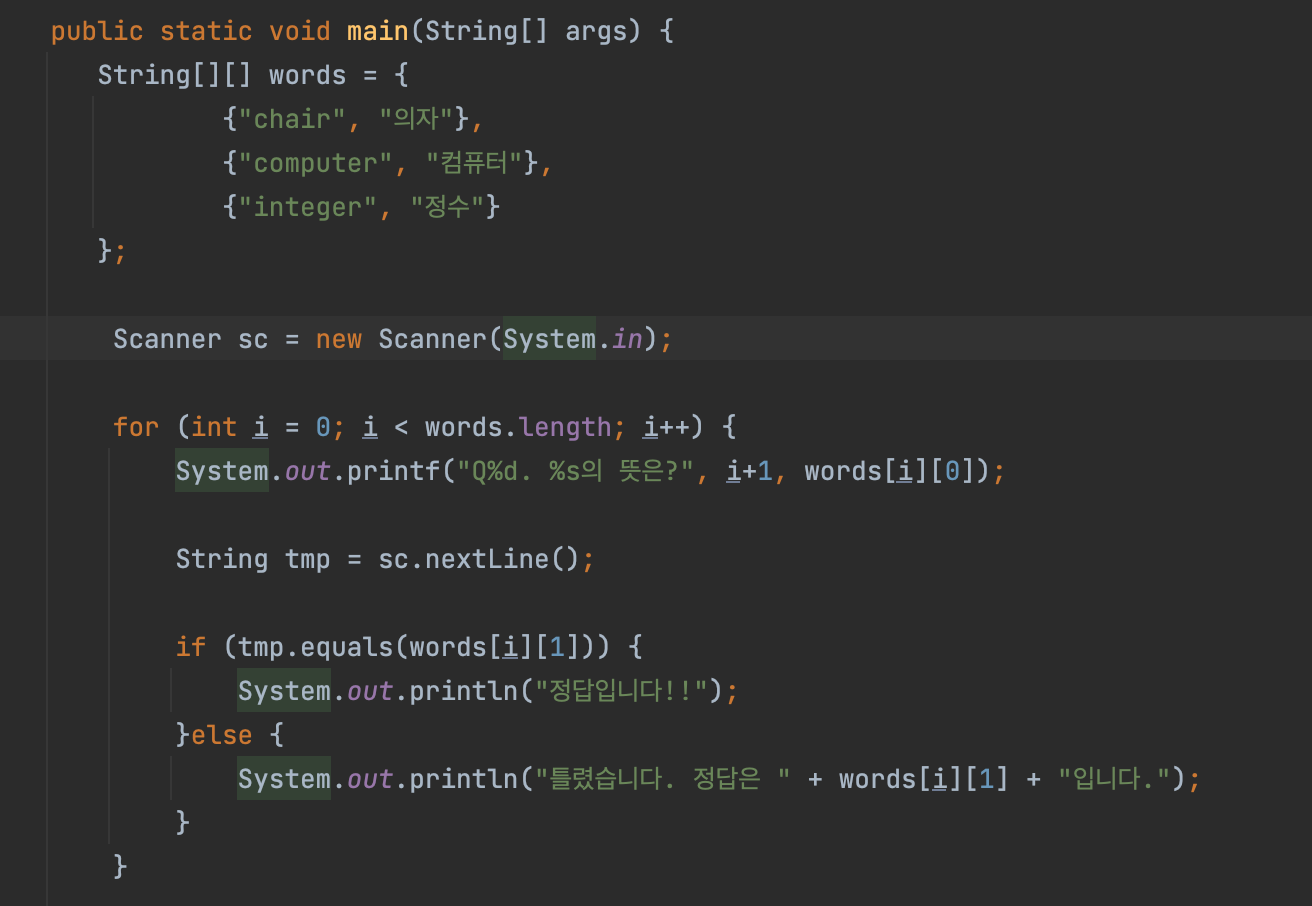 -> 3๊ฐ์ ๋ฌธ์์ด์ ๋ด์ ์ ์๋ ๋ฐฐ์ด์ด ์์ฑ๋๋ค.
