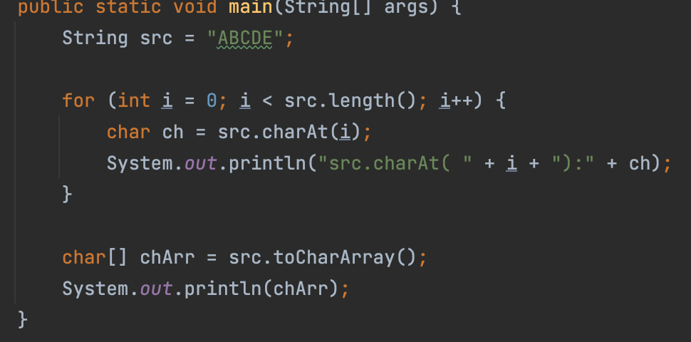 char[] toCharArray() : ๋ฌธ์์ด์ ๋ฌธ์๋ฐฐ์ด(char[])๋ก ๋ณํํด์ ๋ฐํํ๋ค. (String -> char[])