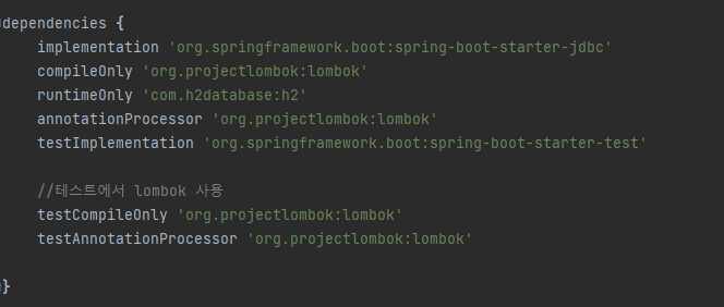 ๊ทธ๋ฆฌ๊ณ ํ ์คํธ์์๋ lombok์ ์ฌ์ฉํ๊ธฐ ์ํด์ ์์กด์ฑ์ ์ถ๊ฐํด์ค๋ค.