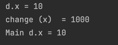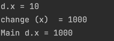 ์ด์ ์์ ์๋ ๋ฌ๋ฆฌ change() ์ ๋งค๊ฐ๋ณ์๋ฅผ ์ฐธ์กฐํ์ผ๋ก ์ ์ธํ๊ธฐ ๋๋ฌธ์ x์ ๊ฐ์ด ์๋ ์ฃผ์๊ฐ ๋งค๊ฐ๋ณ์ d์ ๋ณต์ฌ๋์๋ค.