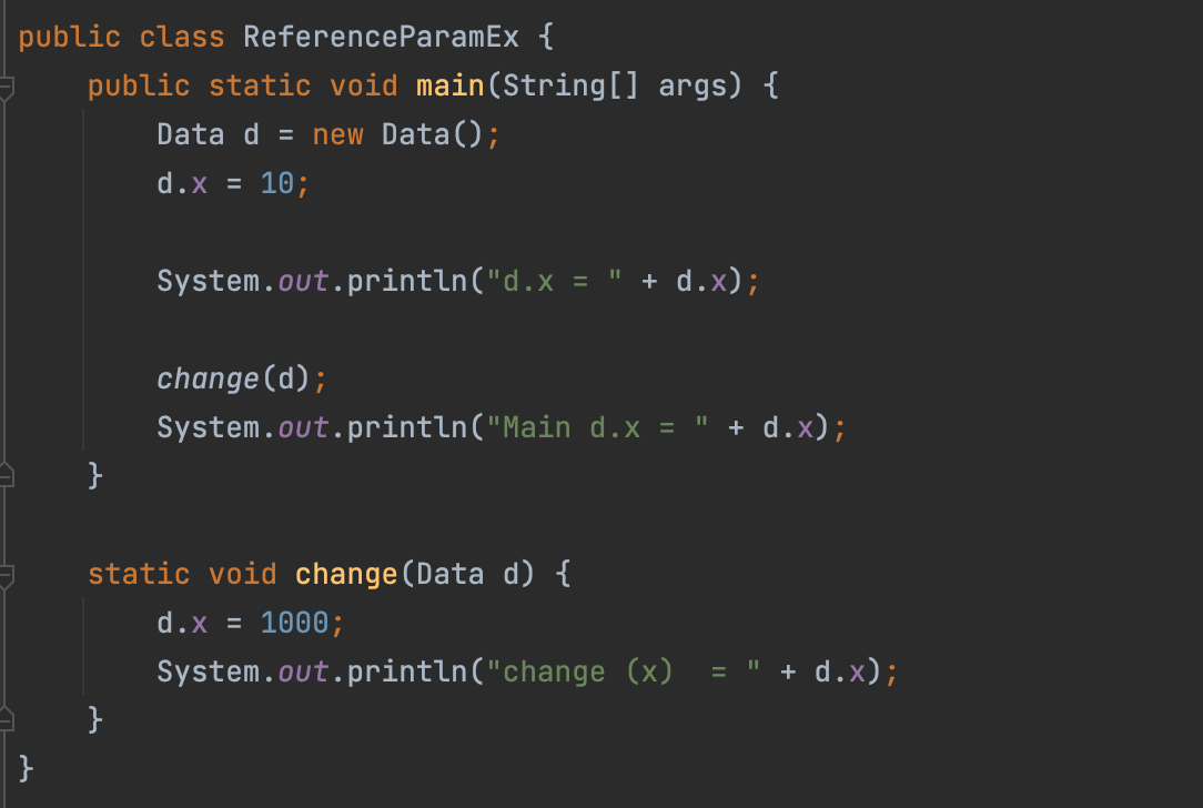 ์ด์ main๋ฉ์๋์ ์ฐธ์กฐ๋ณ์ d์ change ๋ฉ์๋์ ์ฐธ์กฐ๋ณ์ d๋ ๊ฐ์ ๊ฐ์ฒด๋ฅผ ๊ฐ๋ฆฌํค๊ฒ ๋๋ค.