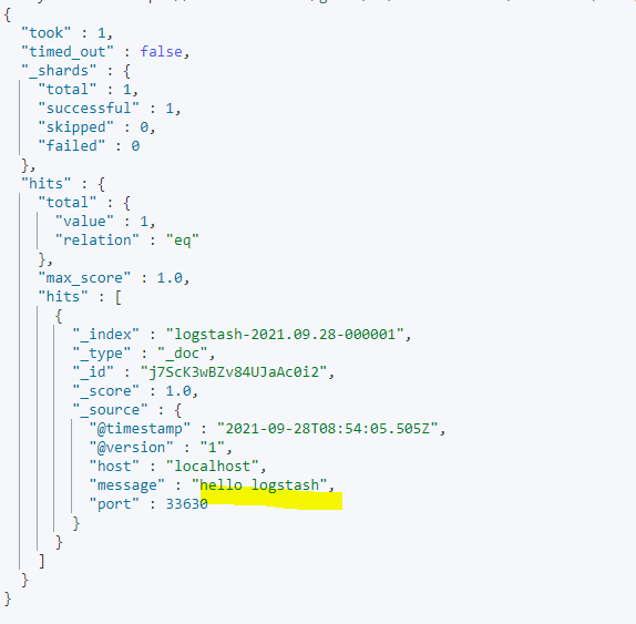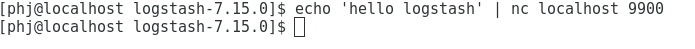 ์๊น input์ผ๋ก hello logstash๊ฐ ์ ๋ค์ด๊ฐ ์๋ค.