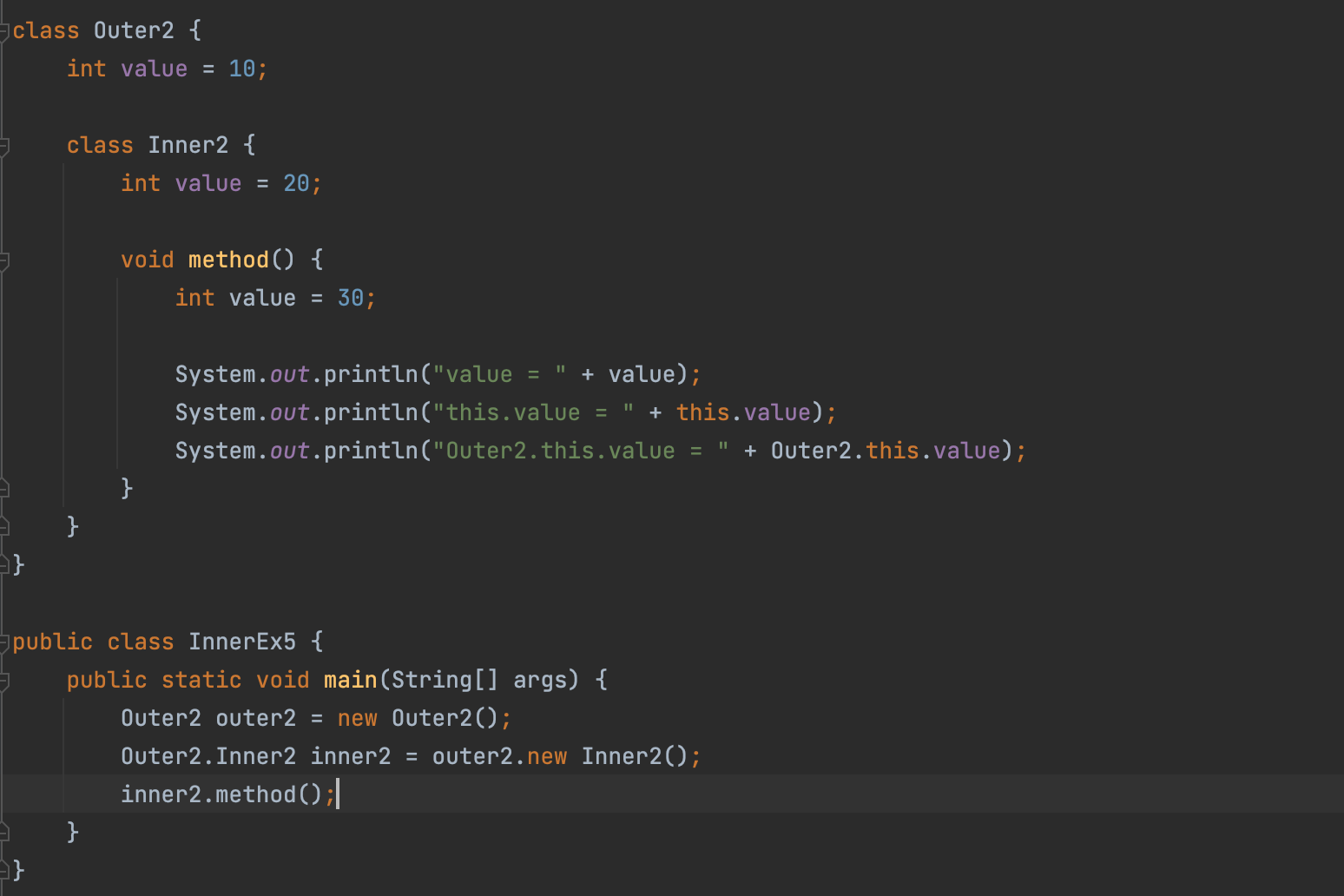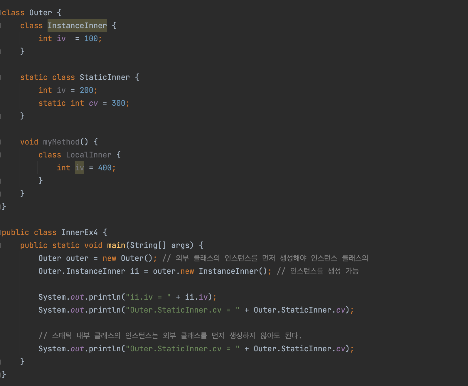 μΈμ€ν΄μ€ ν΄λμ€ (InstancInnser)λ μΈλΆν΄λμ€μ μΈμ€ν΄μ€ λ©€λ²μ΄κΈ° λλ¬Έμ μΈμ€ν΄μ€ outerIvμ outerCvλ₯Ό λͺ¨λ μ¬μ©ν μ μλ€. μ¬μ§μ΄ outerIvμ μ κ·Ό μ μ΄μκ° private μΌμ§λΌλ μ¬μ© κ°λ₯νλ€.