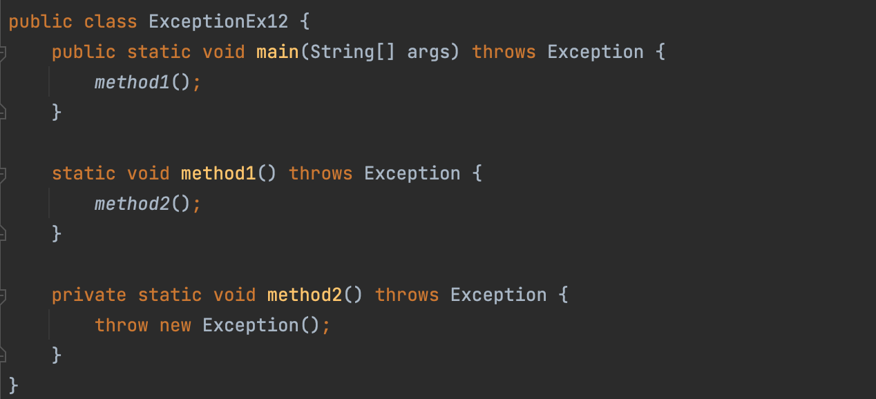 λ©μλμ μμΈλ₯Ό μ μΈνλ €λ©΄, λ©μλμ μ μΈλΆμ ν€μλ throwsλ₯Ό μ¬μ©ν΄μ λ©μλ λ΄μμ λ°μν μ μλ μμΈλ₯Ό μ μ΄μ£ΌκΈ°λ§ νλ©΄ λλ€.