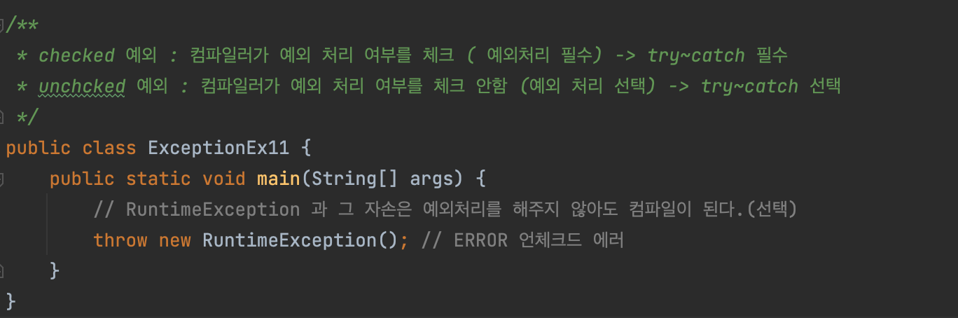 unchecked μμΈ : μ»΄νμΌλ¬κ° μμΈμ²λ¦¬ μ¬λΆλ₯Ό μ²΄ν¬ μν¨ (μμΈμ²λ¦¬ μ ν)
