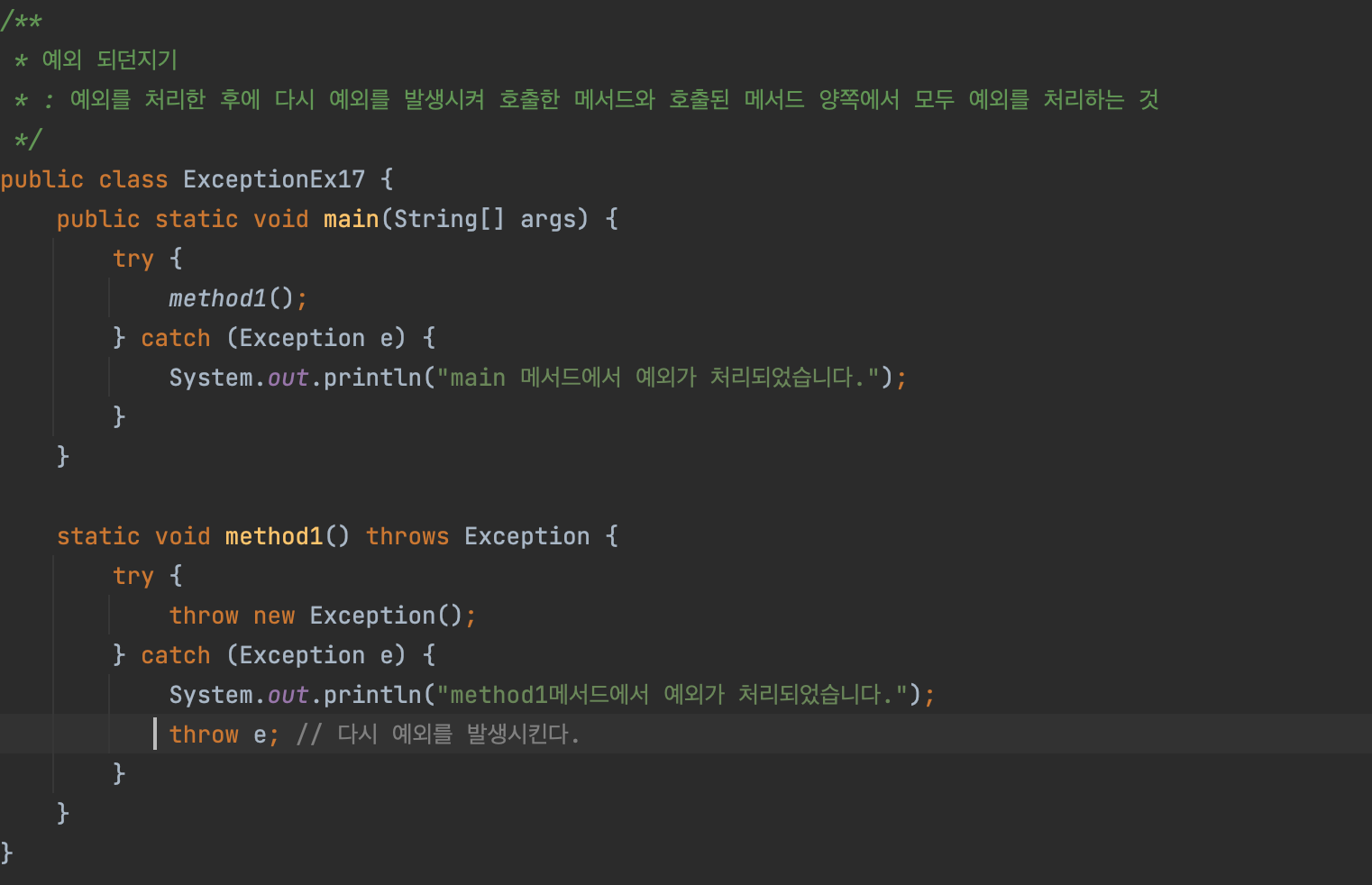 λ€μ λ°μν μμΈλ μ΄ λ©μλλ₯Ό νΈμΆν λ©μλμμ μ λ¬λκ³ νΈμΆν λ©μλμ try-catchλ¬Έμμ μμΈλ₯Ό λ λ€μ μ²λ¦¬νλ€.