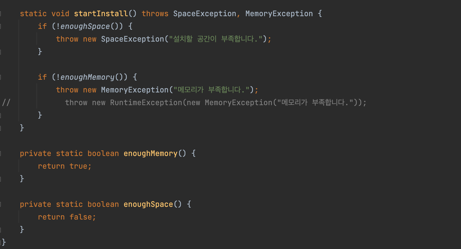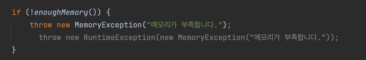 -> MemoryExceptionμ Exceptionμ μμμΌλ‘ λ°λμ μμΈλ₯Ό μ²λ¦¬ν΄μΌνλλ° μ΄ μμΈλ₯Ό RuntimeExceptionμΌλ‘ κ°μΈλ²λ ΈκΈ° λλ¬Έμuncheked μμΈκ° λμλ€.