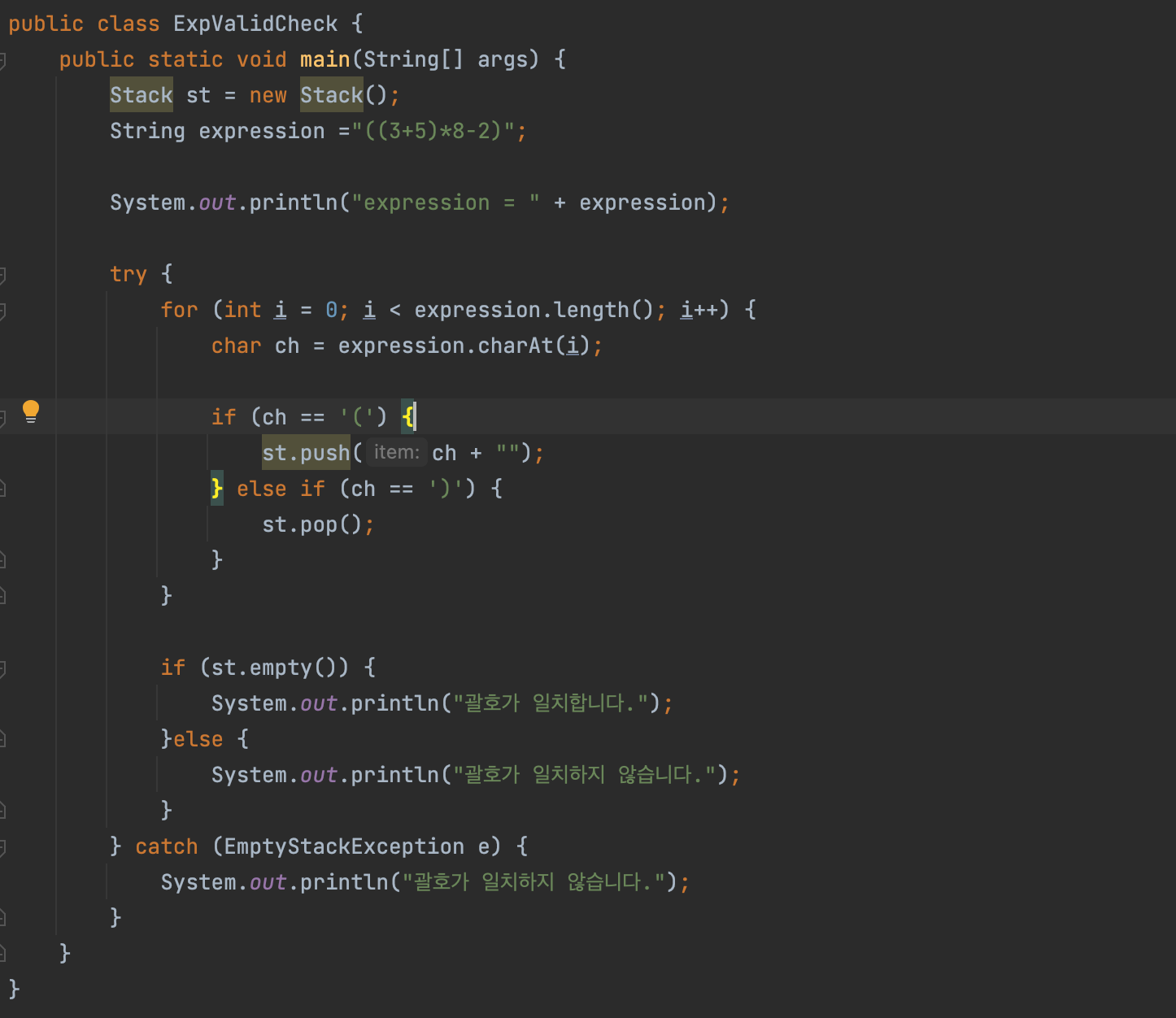 ')'λ₯Ό λ§λμ '('λ₯Ό κΊΌλ΄λ €κ³ ν λ μ€νμ΄ λΉμ΄μκ±°λ μμμ κ²μ¬νκ³ λ νμλ μ€νμ΄ λΉμ΄μμ§ μμΌλ©΄ κ΄νΈκ° μλͺ»λμλ€λ λ»μ΄λ€.