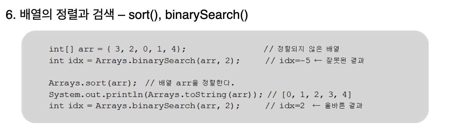 sort()λ λ°°μ΄μ μ λ ¬ν λ, κ·Έλ¦¬κ³ λ°°μ΄μ μ μ₯λ μμλ₯Ό κ²μν λλ binarySearch()λ₯Ό μ¬μ©νλ€.