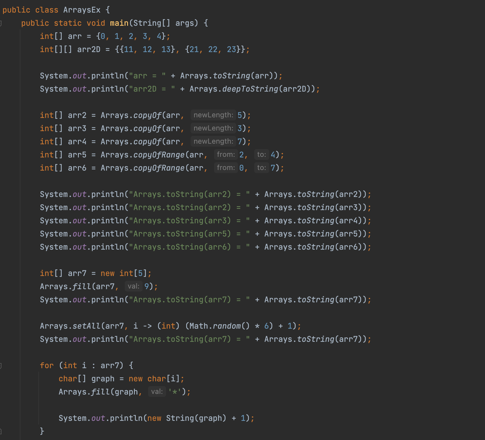 copyOf()λ λ°°μ΄ μ 체λ₯Ό, copyOfRange()λ λ°°μ΄μ μΌλΆλ₯Ό 볡μ¬ν΄μ μλ‘μ΄ λ°°μ΄μ λ§λ€μ΄μ λ°ννλ€.