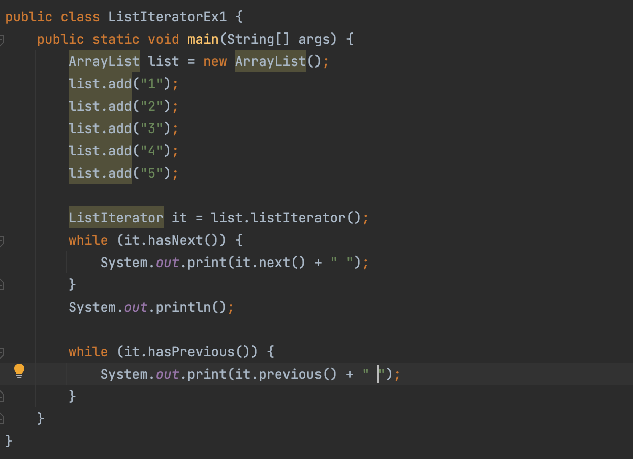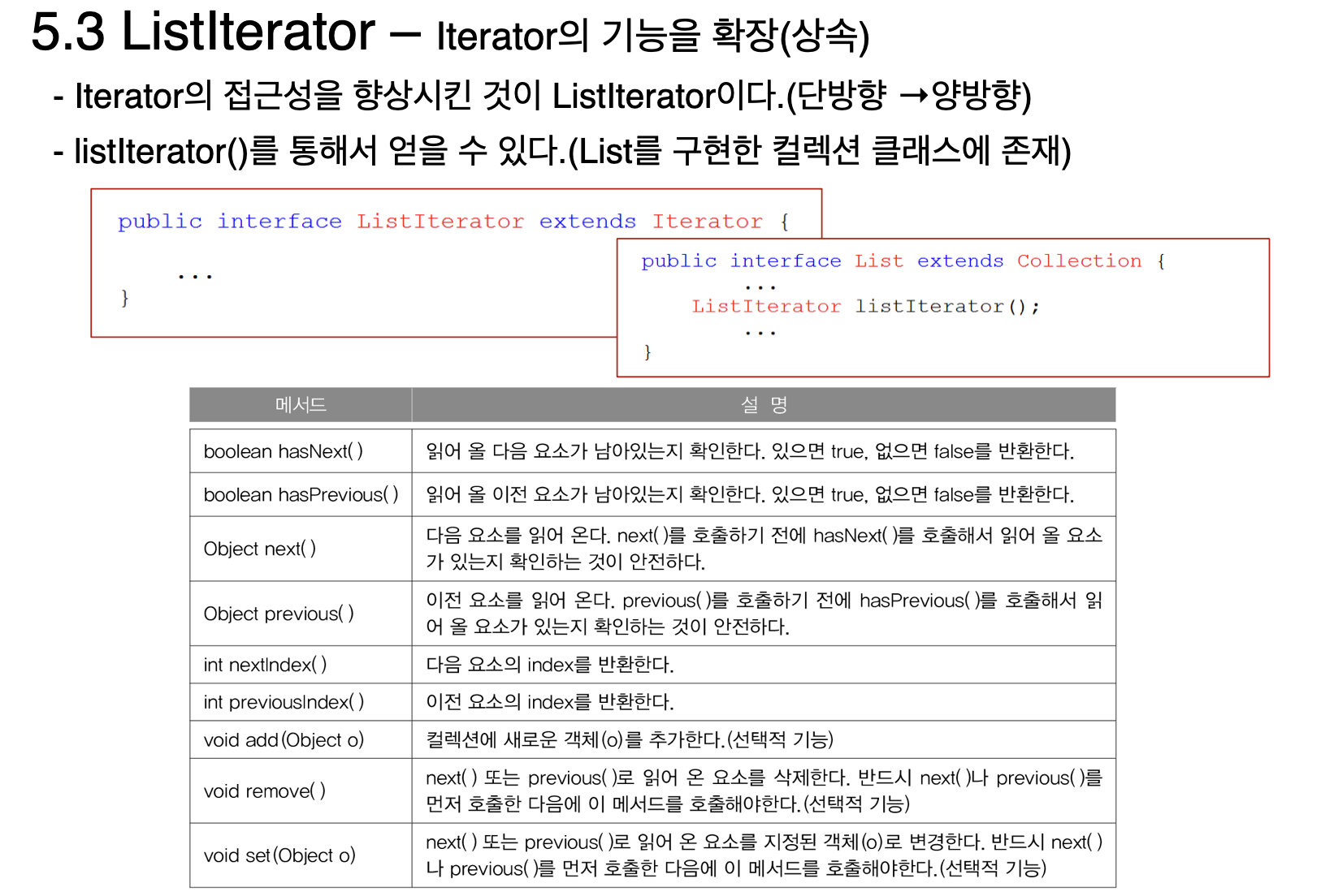 -> Iteratorλ λ¨λ°©ν₯μΌλ‘λ§ μ΄λνκΈ° λλ¬Έμ 컬λ μ μ λ§μ§λ§ μμμ λ€λ€λ₯΄λ©΄ λ μ΄μ μ¬μ©ν μ μμ§λ§, ListIteratorλ μλ°©ν₯μΌλ‘ μ΄λνκΈ° λλ¬Έμ κ° μμκ°μ μ΄λμ΄ μμ λ‘λ€.