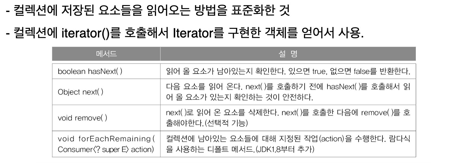 컬λ μ μ μ μ₯λ κ° μμμ μ κ·Όνλ κΈ°λ₯μ κ°μ§ Iterator μΈν°νμ΄μ€λ₯Ό μ μνκ³ , CollectionμΈν°νμ΄μ€μλ Iterator()λ₯Ό μ μνκ³ μλ€.