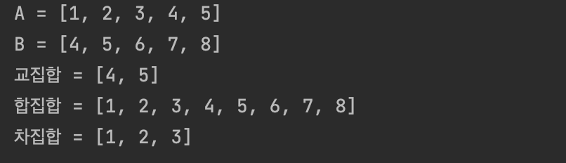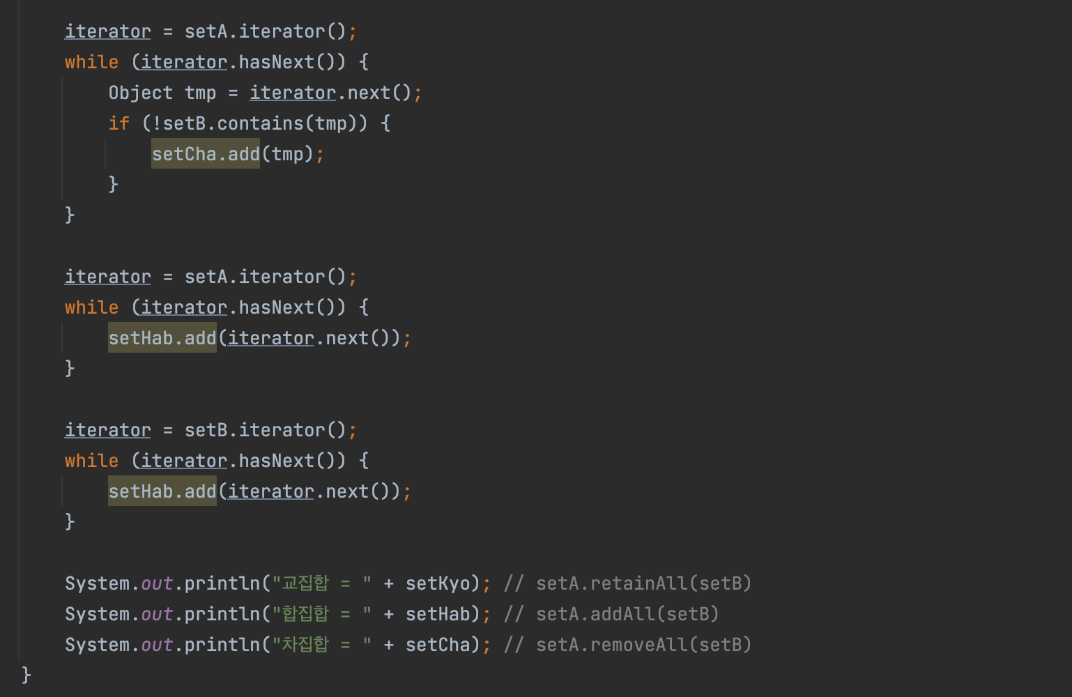 ๊ทผ๋ฐ retainAll, addAll, removeAll ๋ฉ์๋๋ฅผ ํ์ฉํ๋ฉด ์ข ๋ ์ฝ๊ฒ ํฉ์งํฉ, ๊ต์งํฉ, ์ฐจ์งํฉ์ ๊ตฌํ ์ ์๊ธดํ๋ค.