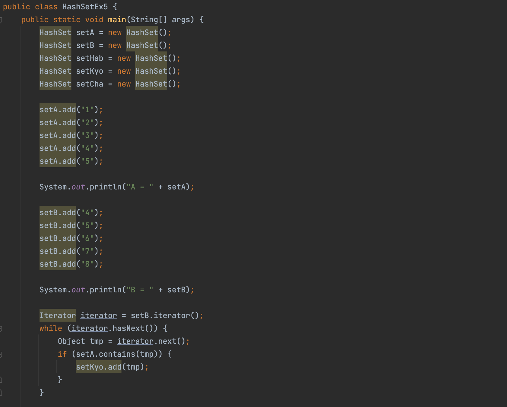 -> ์ด ์์ ๋ ๋ ๊ฐ์ HashSet์ ์ ์ฅ๋ ๊ฐ์ฒด๋ค์ ๋น๊ตํด์ ํฉ์งํฉ, ๊ต์งํฉ, ์ฐจ์งํฉ์ ๊ตฌํ๋ ๋ฐฉ๋ฒ์ ๋ณด์ฌ์ค๋ค,