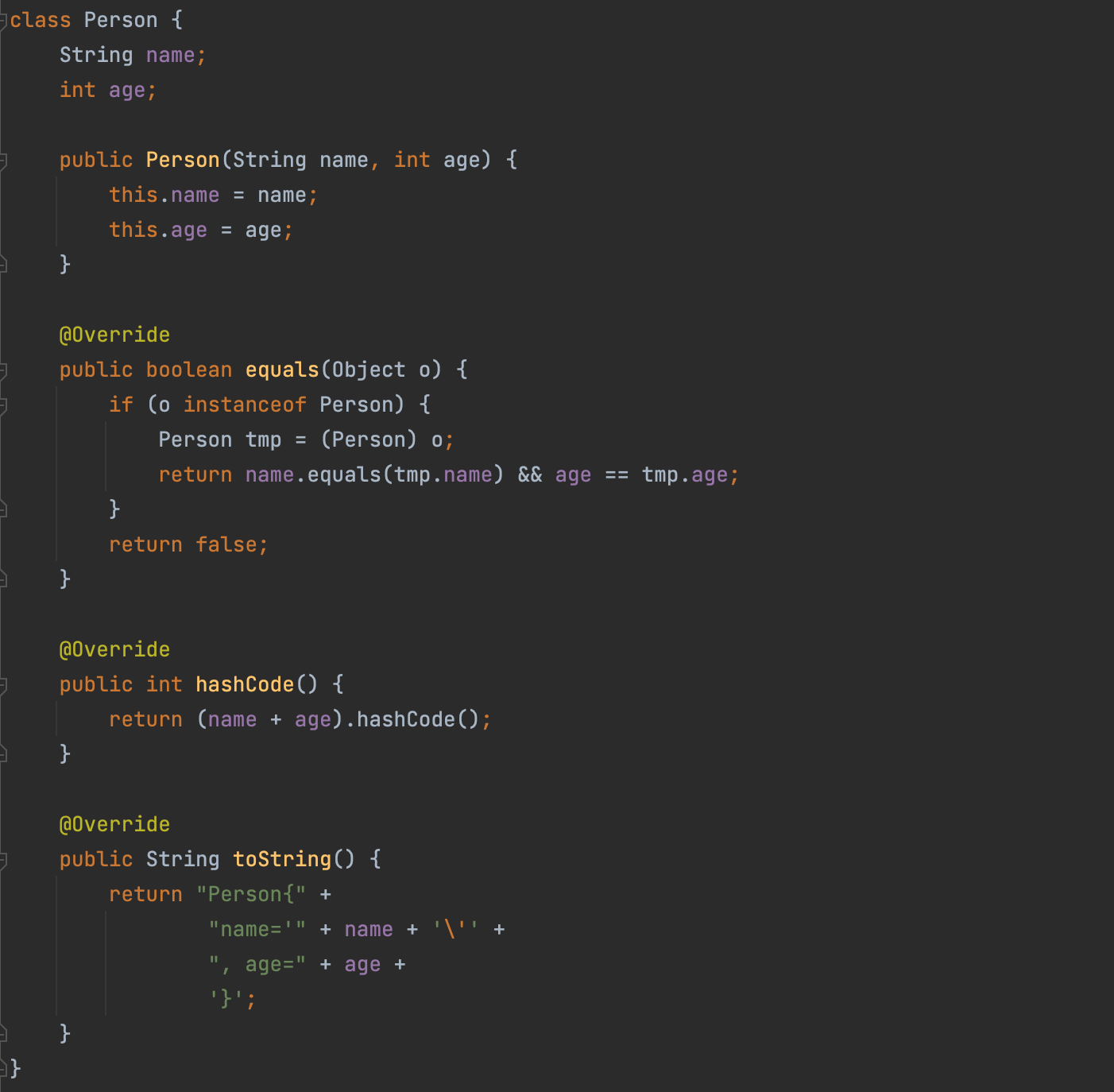Personํด๋์ค์์ ๋ ์ธ์คํด์ค์ name๊ณผ age๊ฐ ๊ฐ์ผ๋ฉด true ๋ฅผ ๋ฐํํ๋๋ก equals()๋ฅผ ์ค๋ฒ๋ผ์ด๋ฉ ํ๋ค.