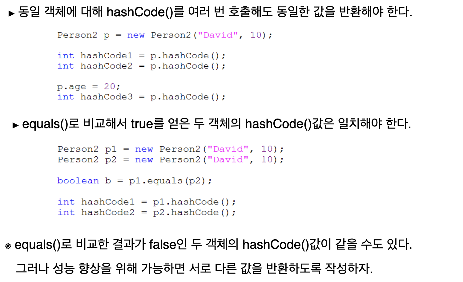 -> HashSet์ add ๋ฉ์๋๋ ์๋ก์ด ์์๋ฅผ ์ถ๊ฐํ๊ธฐ ์ ์ ๊ธฐ์กด์ ์ ์ฅ๋ ์์์ ๊ฐ์ ๊ฒ์ธ์ง ํ๋ณํ๊ธฐ ์ํด ์ถ๊ฐํ๋ ค๋ ์์์ equals()์ hashcode()๋ฅผ ํธ์ถํ๊ธฐ ๋๋ฌธ์ equals()์ hashCode()๋ฅผ ๋ชฉ์ ์ ๋ง๊ฒ ์ค๋ฒ๋ผ์ด๋ฉ ํด์ผํ๋ค.
