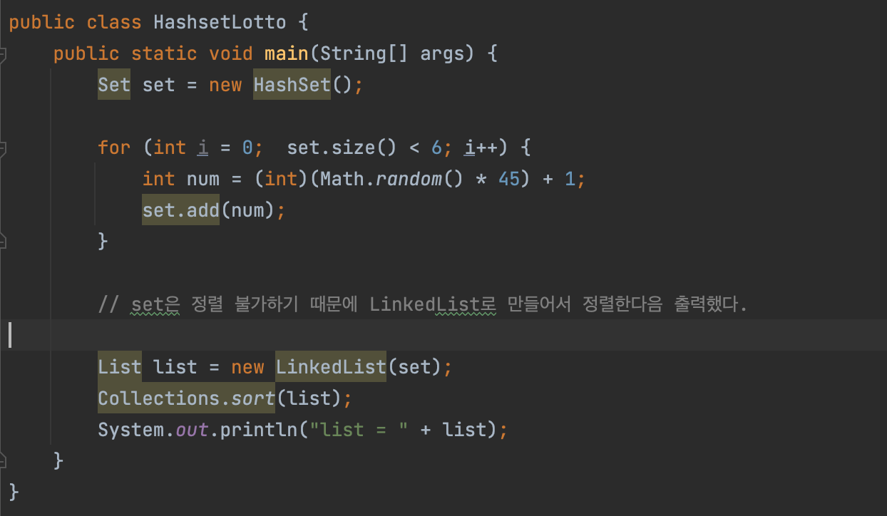 -> Math.random()์ ์ฌ์ฉํด์ ์คํํ ๋ ๋ง๋ค ๊ฒฐ๊ณผ๊ฐ ๋ค๋ฅด๊ณ , HashSet์ ์ฑ์ง์ ์ด์ฉํด์ ๋ก๋๋ฒํธ๋ฅผ ๋ง๋๋ ์์ ์ด๋ค.