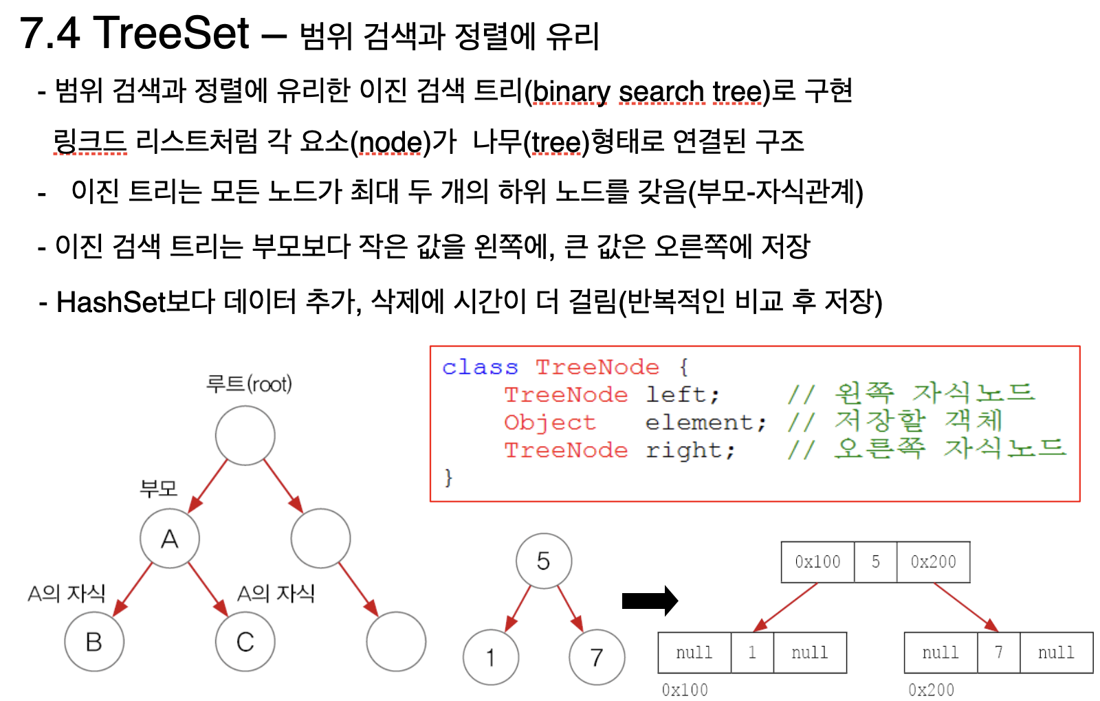 TreeSet์ ์ ๋ ฌ๋์ํ๋ฅผ ์ ์งํ๊ธฐ ๋๋ฌธ์ ๋จ์ผ ๊ฐ ๊ฒ์๊ณผ ๋ฒ์๊ฒ์(์๋ฅผ ๋ค๋ฉด 3๊ณผ 7์ฌ์ด์ ๋ฒ์์ ์๋ ๊ฐ์ ๊ฒ์)ํ ๋ ๋น ๋ฅด๋ค.