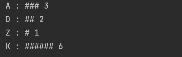 -> ๋ฌธ์์ด ๋ฐฐ์ด์ ๋ด๊ธด ๋ฌธ์์ด์ ํ๋์ฉ ์ฝ์ด์ HashMAp์ ํค๋ก ์ ์ฅํ๊ณ ๊ฐ์ผ๋ก 1์ ์ ์ฅํ๋ค.