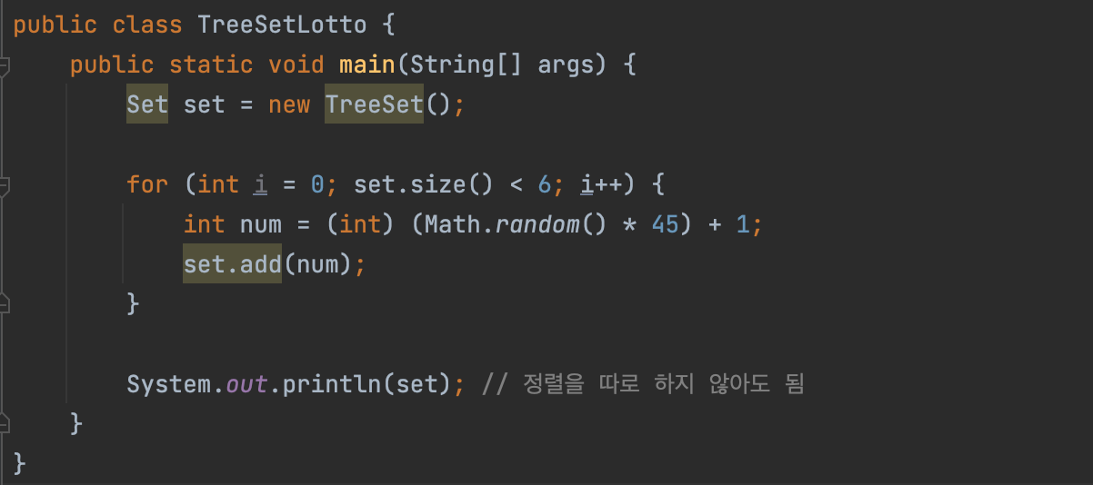 -> ์ ๋ฒ์ HashSet์ผ๋ก Lotto ๋ฒํธ๋ฅผ ๋ง๋๋ ์์ ์์๋ ์ ๋ ฌํ๋ ์ฝ๋๊ฐ ๋ค์ด๊ฐ์๋๋ฐ TreeSet์ ์ด๋ฏธ ์ ๋ ฌ์ ํ๊ธฐ ๋๋ฌธ์ ์ ๋ ฌํ๋ ์ฝ๋๋ฅผ ๋ฃ์ ํ์๊ฐ ์๋ค.
