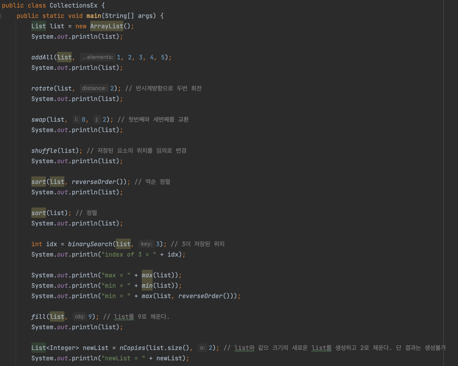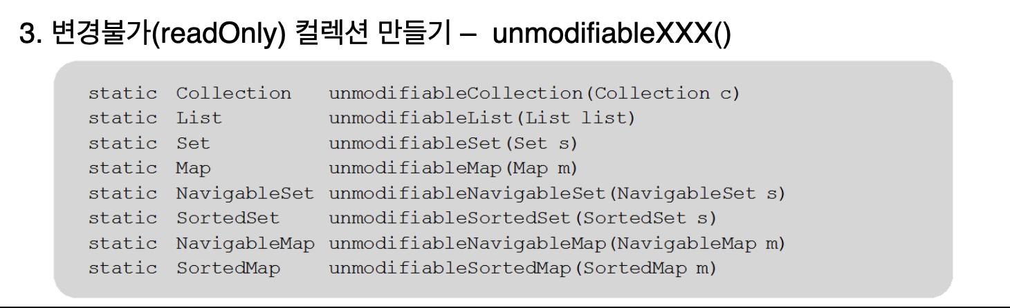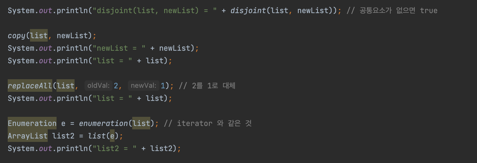 Arrays๊ฐ ๋ฐฐ์ด๊ณผ ๊ด๋ จ๋ ๋ฉ์๋๋ฅผ ์ ๊ณตํ๋ ๊ฒ์ฒ๋ผ, Collections๋ ์ปฌ๋ ์ ๊ณผ ๊ด๋ จ๋ ๋ฉ์๋๋ฅผ ์ ๊ณตํ๋ค.