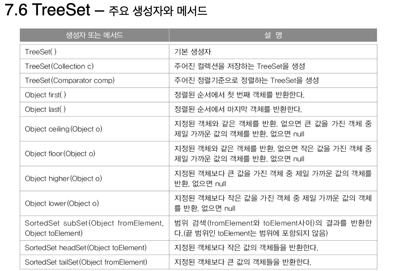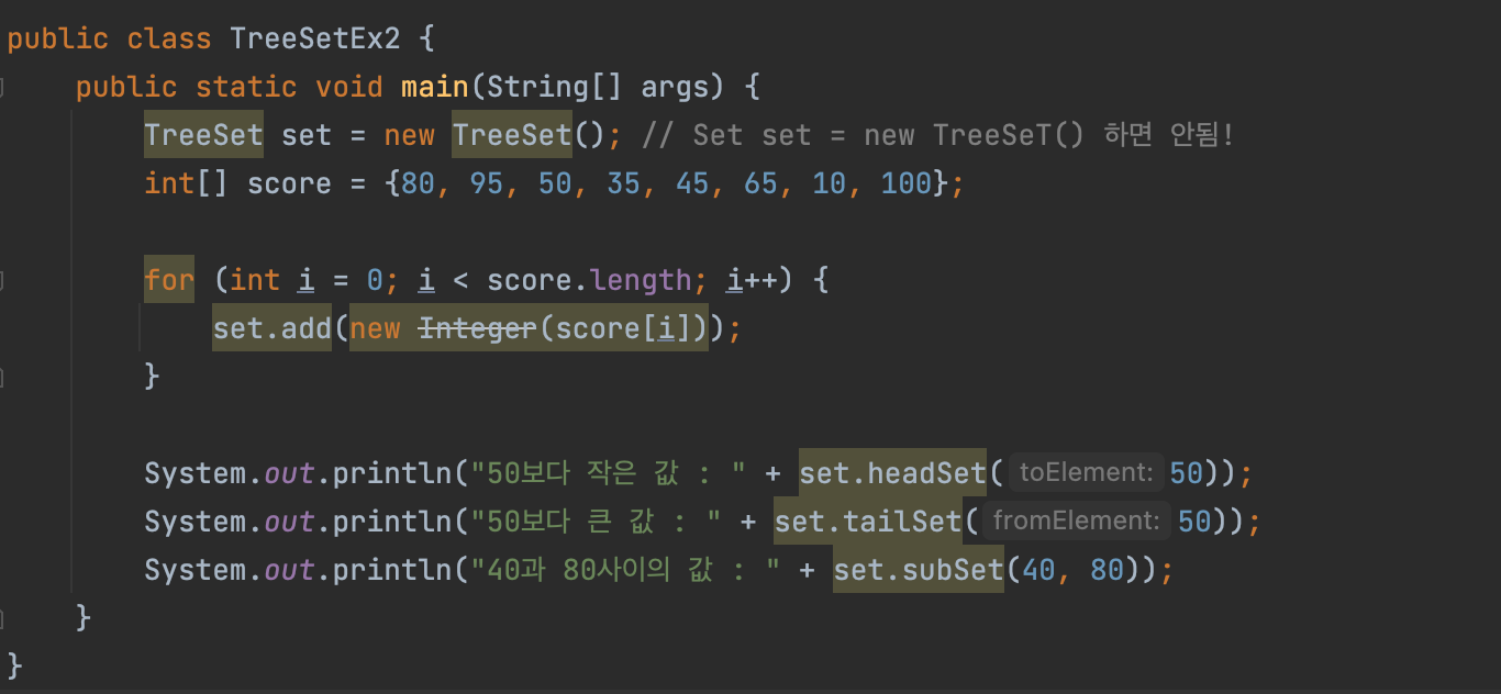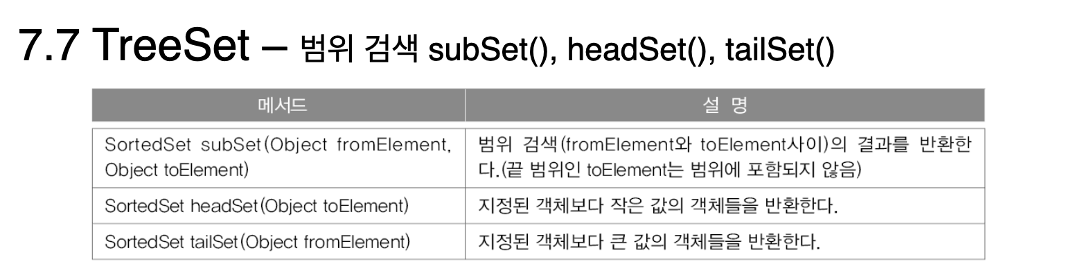 -> headSet ๋ฉ์๋์ tailSet ๋ฉ์๋๋ฅผ ์ด์ฉํ๋ฉด, TreeSet์ ์ ์ฅ๋ ๊ฐ์ฒด ์ค ์ง์ ๋ ๊ธฐ์ค ๊ฐ ๋ณด๋ค ํฐ ๊ฐ์ ๊ฐ์ฒด๋ค๊ณผ ์์ ๊ฐ์ ๊ฐ์ฒด๋ค์ ์ป์ ์ ์๋ค.