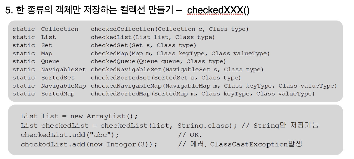 ๋๋ถ๋ถ์ ๊ฒฝ์ฐ ํ ์ข ๋ฅ์ ๊ฐ์ฒด๋ฅผ ์ ์ฅํ๋ฉฐ, ์ปฌ๋ ์ ์ ์ง์ ๋ ์ข ๋ฅ์ ๊ฐ์ฒด๋ง ์ ์ฅํ ์ ์๋๋ก ์ ํํ๊ณ ์ถ์ ๋ ์ด ๋ฉ์๋๋ฅผ ์ฌ์ฉํ๋ค.