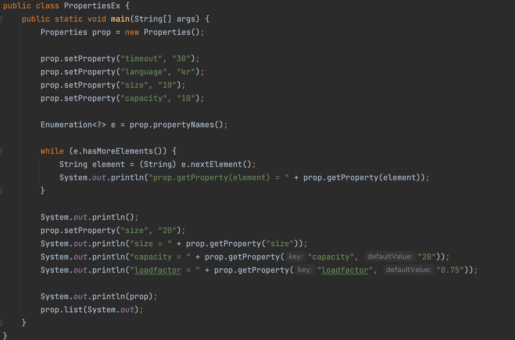 : Properties์ ์ ์ฅ๋์ด ์๋ ๋ชจ๋ ํคkey ๋ฅผ Set์ ๋ด์์ ๋ฐํํ๋ค.