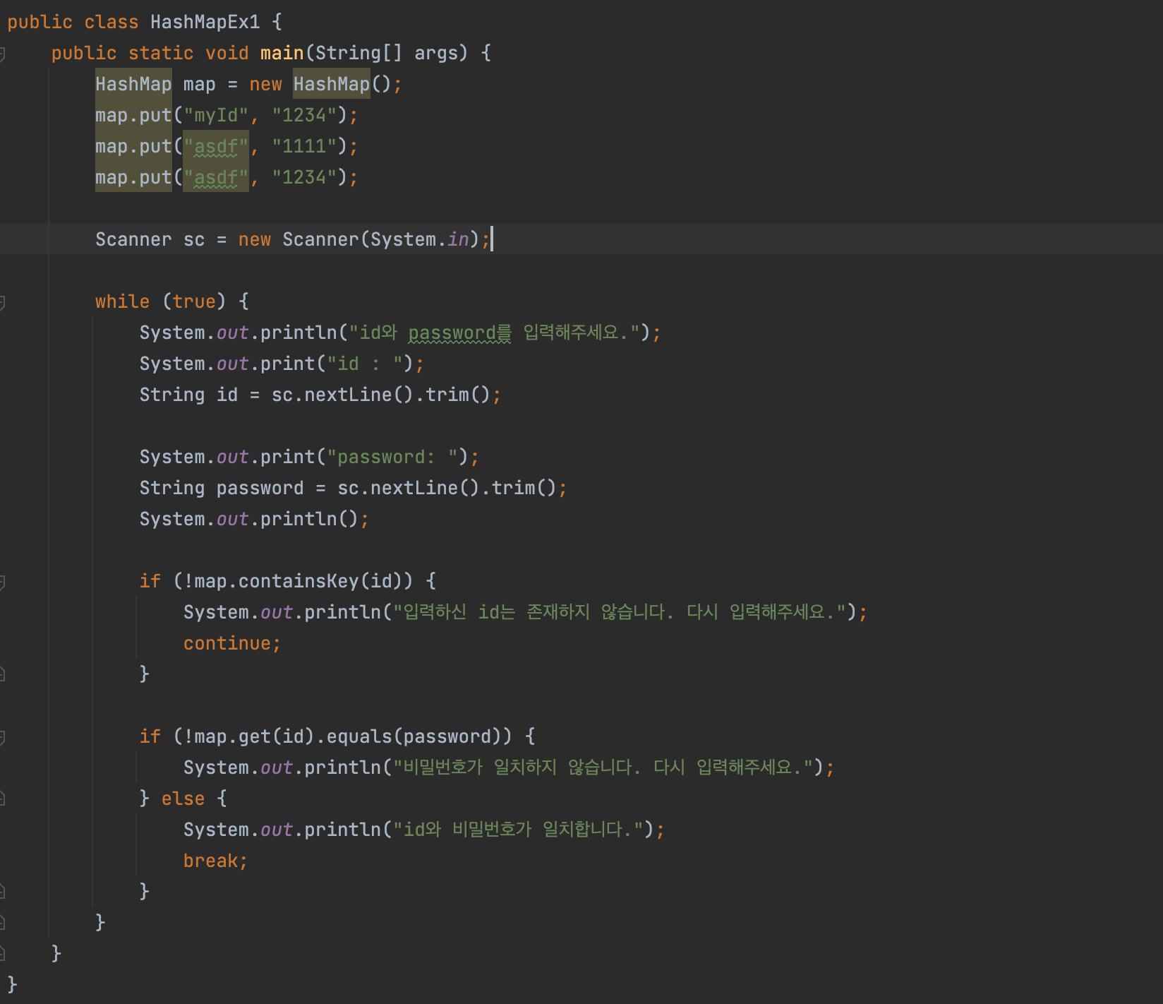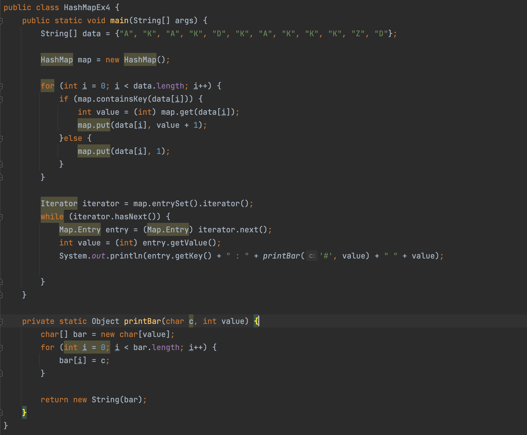 HashMap์ ๊ฐ์ ๋ฌธ์์ด์ด ํค๋ก ์ ์ฅ๋์ด ์๋์ง containsKey()๋ก ํ์ธํ์ฌ ์ด๋ฏธ ์ ์ฅ๋์ด ์๋ ๋ฌธ์์ด์ด๋ฉด ๊ฐ์ 1 ์ฆ๊ฐ์ํจ๋ค.