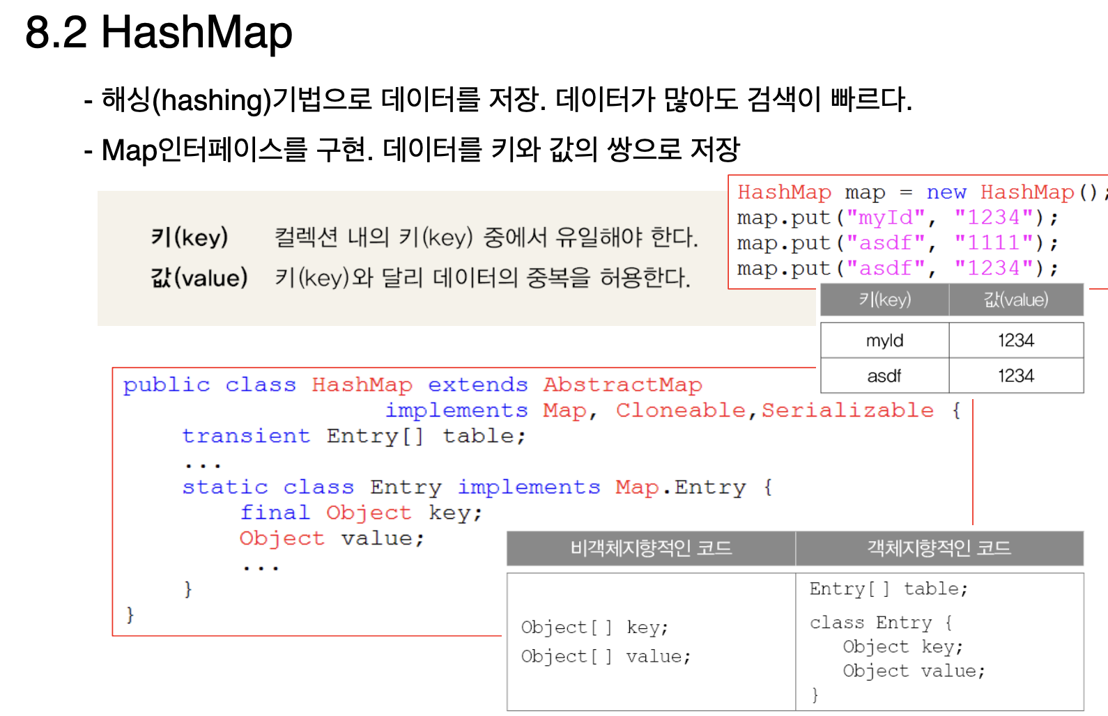 HashMap์ Map์ ๊ตฌํํ์ผ๋ฏ๋ก Map์ ํน์ง, ํค(key)์ ๊ฐ(value)์ ๋ฌถ์ด์ ํ๋์ ๋ฐ์ดํฐ(entry)๋ก ์ ์ฅํ๋ค.