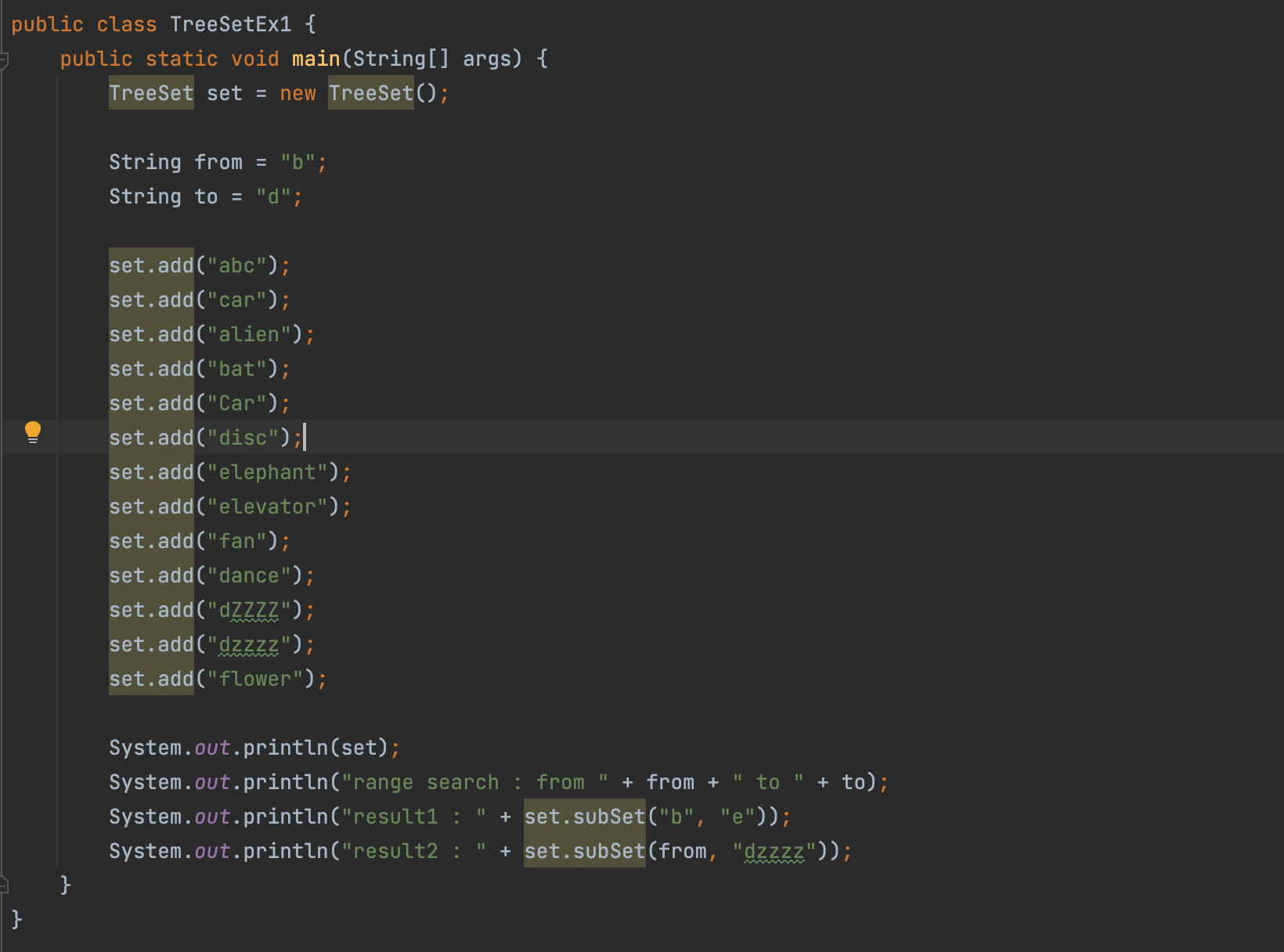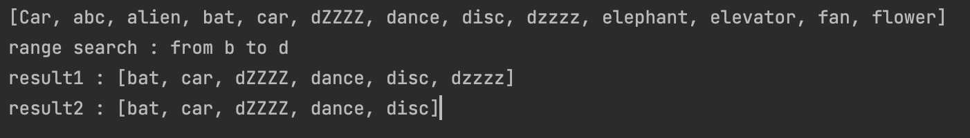 -> subSet() ์ ์ด์ฉํด์ ๋ฒ์๊ฒ์(range search)๋ฅผ ํ ๋ ์์ ๋ฒ์๋ ํฌํจ๋์ง๋ง ๋ ๋ฒ์๋ ํฌํจ๋์ง ์์ผ๋ฏ๋ก result1์๋ c๋ก ์์ํ๋ ๋จ์ด๊น์ง๋ง ๊ฒ์ ๊ฒฐ๊ณผ์ ํฌํจ๋์ด ์๋ค.