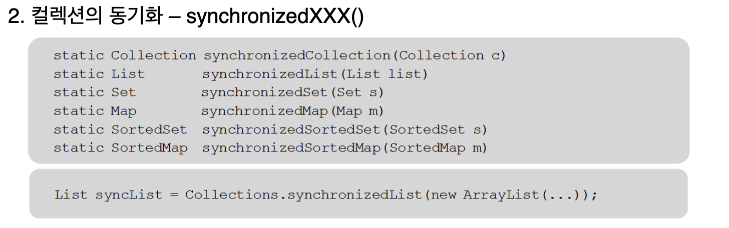๊ทธ๋์ ์๋ก ์ถ๊ฐ๋ ArrayList์ HashMap๊ณผ ๊ฐ์ ์ปฌ๋ ์ ์ ๋๊ธฐํ๋ฅผ ์์ฒด์ ์ผ๋ก ์ฒ๋ฆฌํ์ง ์๊ณ ํ์ํ ๊ฒฝ์ฐ์๋ง java.util.Collections ํด๋์ค์ ๋๊ธฐํ ๋ฉ์๋๋ฅผ ์ด์ฉํด์ ๋๊ธฐํ ์ฒ๋ฆฌ๊ฐ ๊ฐ๋ฅํ๋๋ก ๋ณ๊ฒฝํ๋ค.