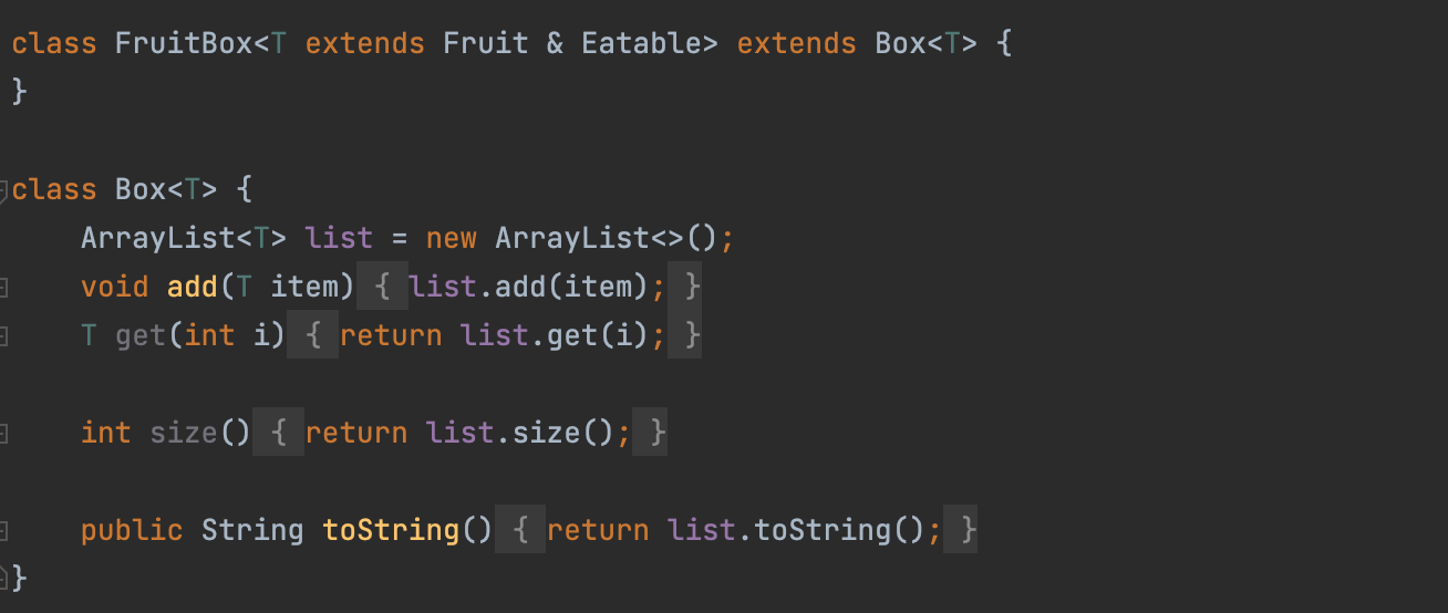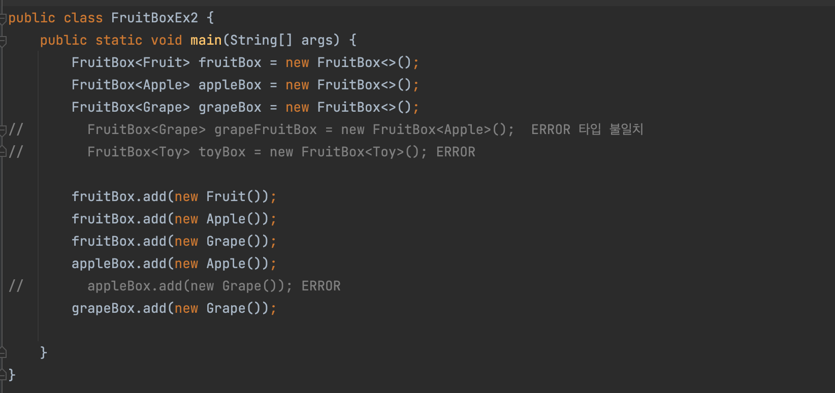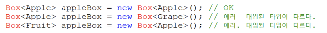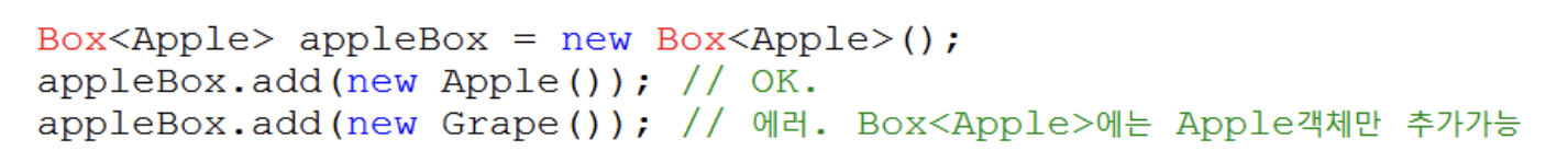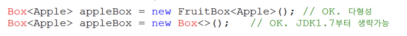 κ·Έλ¦¬κ³ jdk1.7λΆν°λ μΆμ μ΄ κ°λ₯ν κ²½μ° νμ μ μλ΅ν μ μκ² λλ€. μ°Έμ‘°λ³μμ νμ μΌλ‘λΆν° Boxκ° Appleνμ μ κ°μ²΄λ§ μ μ₯νλ€λ κ²μ μμ μκΈ° λλ¬Έμ μμ±μμ λ°λ³΅ν΄μ νμ μ μ§μ ν΄μ£Όμ§ μμλ λλ€.