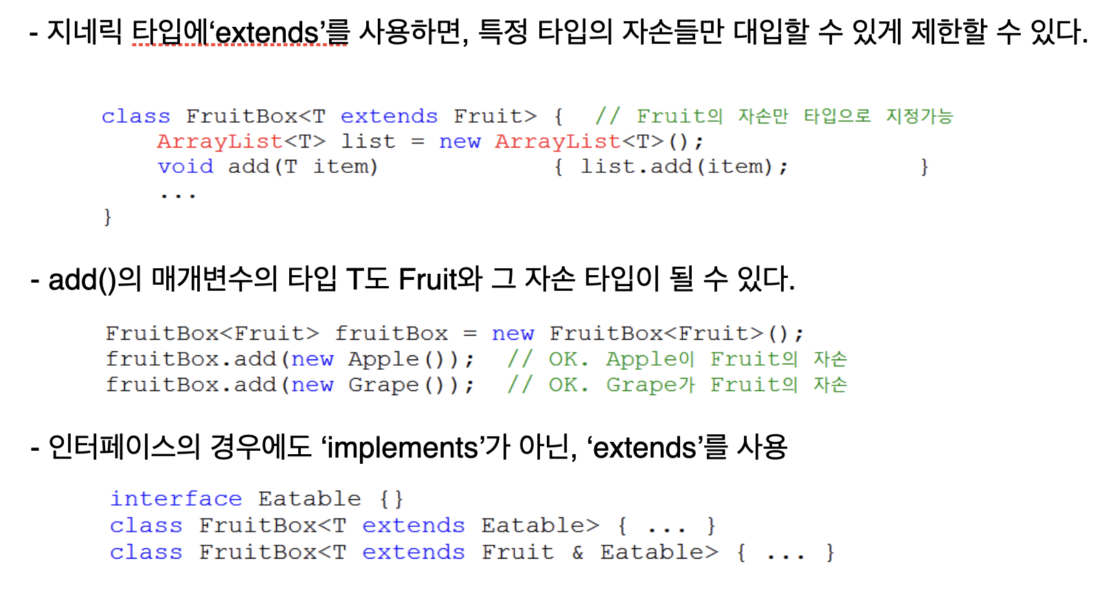 νμ λ§€κ°λ³μ Tμ μ§μ ν μ μλ νμ μ μ’ λ₯λ₯Ό μ ννκΈ° μν΄μλ extends ν€μλλ₯Ό μ¬μ©νλ©΄ νΉμ νμ μ μμλ€λ§ λμ ν μ μμ μ νν μ μλ€.