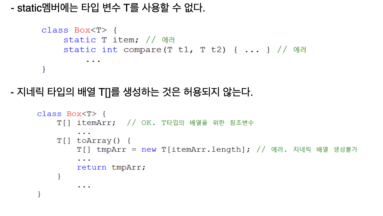 -> staticλ©€λ²λ νμ λ³μμ μ§μ λ νμ , μ¦ λμ λ νμ μ μ’ λ₯μ κ΄κ³μμ΄ λμΌν κ²μ΄μ΄μΌ νκΈ° λλ¬Έμ static λ©€λ²μλ νμ λ³μλ₯΄ μ§μ ν μ μλ€. μ¦ Box<Apple>.itemκ³Ό Box<Grape>.itemμ΄ λ€λ₯Έ κ²μ΄λ©΄ μλλ€λ λ»μ΄λ€!!