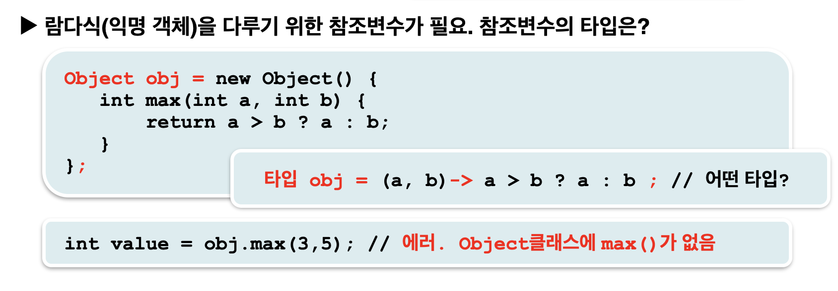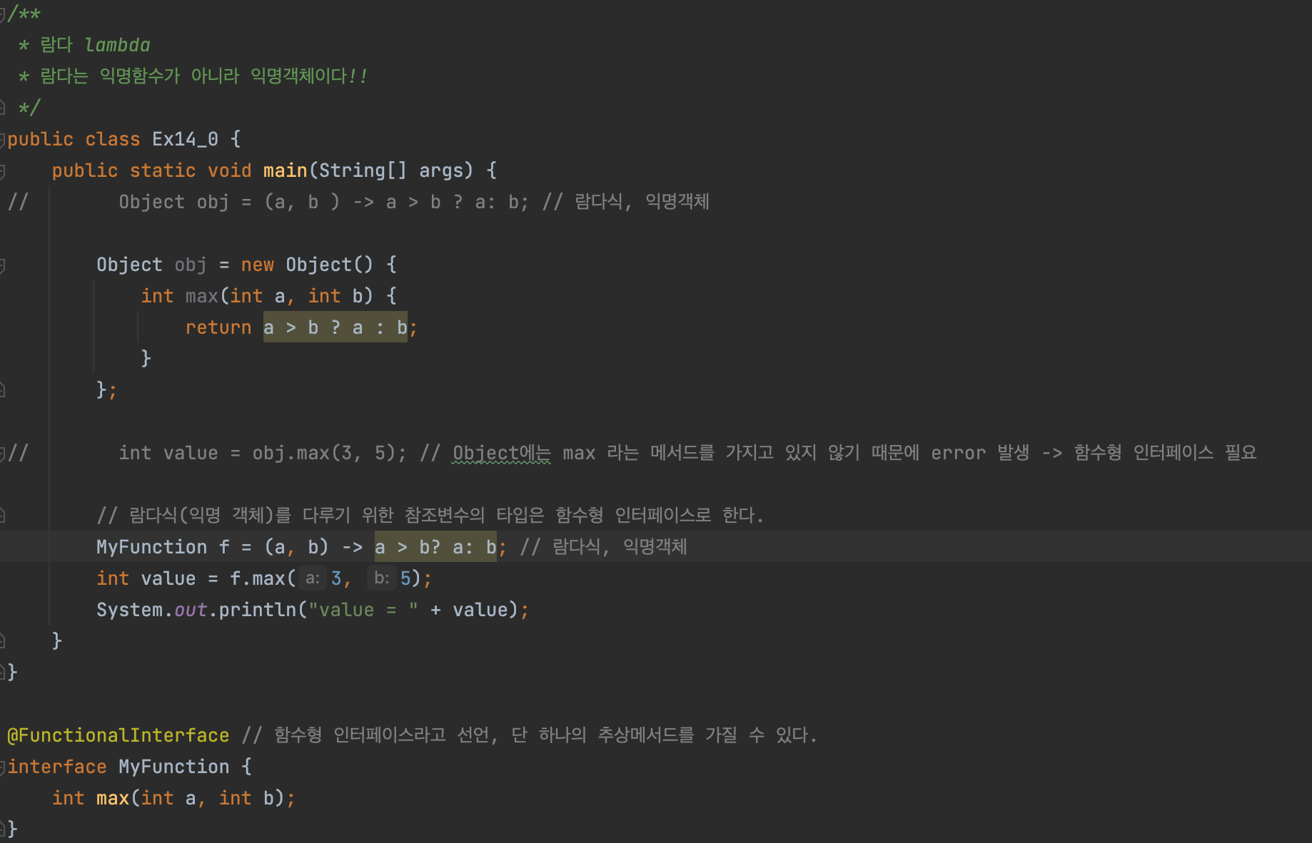MyFunction μΈν°νμ΄μ€λ₯Ό ꡬνν μ΅λͺ κ°μ²΄λ₯Ό λλ€μμΌλ‘ λ체 κ°λ₯ν μ΄μ λ λλ€μλ μ€μ λ‘λ μ΅λͺ κ°μ²΄μ΄κ³ , MyFunction μΈν°νμ΄μ€λ₯Ό ꡬνν μ΅λͺ κ°μ²΄μ λ©μλ max()μ λλ€μμ λ§€κ°λ³μ νμ κ³Ό κ°μ κ·Έλ¦¬κ³ λ°νκ°μ΄ μΌμΉνκΈ° λλ¬Έμ΄λ€!
