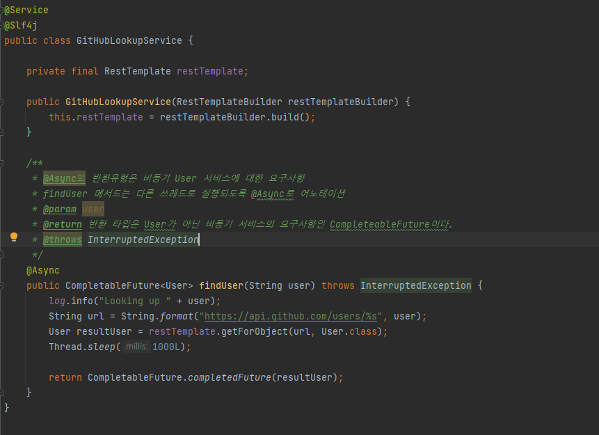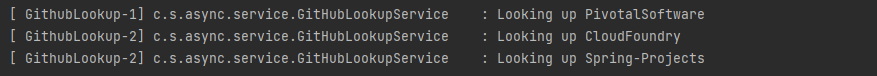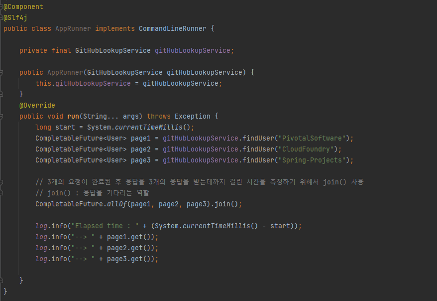findUser()๋ @Async ์ด๋ ธํ ์ด์ ์ ์ฌ์ฉํ์ฌ ๋น๋๊ธฐ์์ผ๋ก ์ฒ๋ฆฌ๋ฅผ ์ง์ ํ์๊ณ , PivotalSoftware, CloudFoundry, Spring-Projects ์ ์ ์ ๋ณด ์กฐํ api๋ ์๋ต์ด ์ค์ง ์๋๋ผ๋ ๋จผ์ ์์ฒญ์ด ์ด๋ฃจ์ด์ง๋ค.