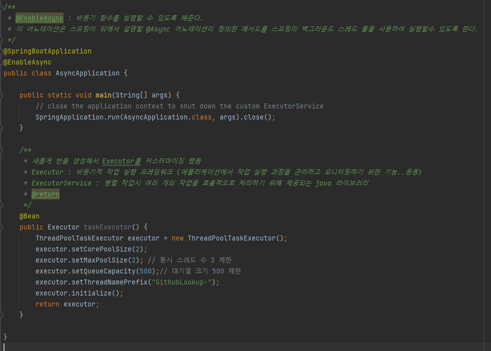 ๊ทธ๋ฆฌ๊ณ Executor๋ฅผ ๋ฐํํ๋ taskExecutor()๋ฅผ ์ ์ํ์ฌ ์ค๋ ๋ ํ์ ๋ํด ์ค์ ํด์ฃผ์๋ค.