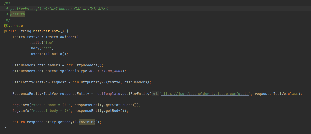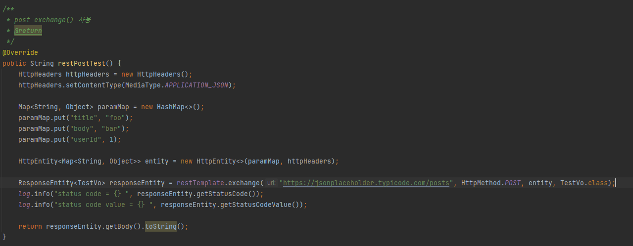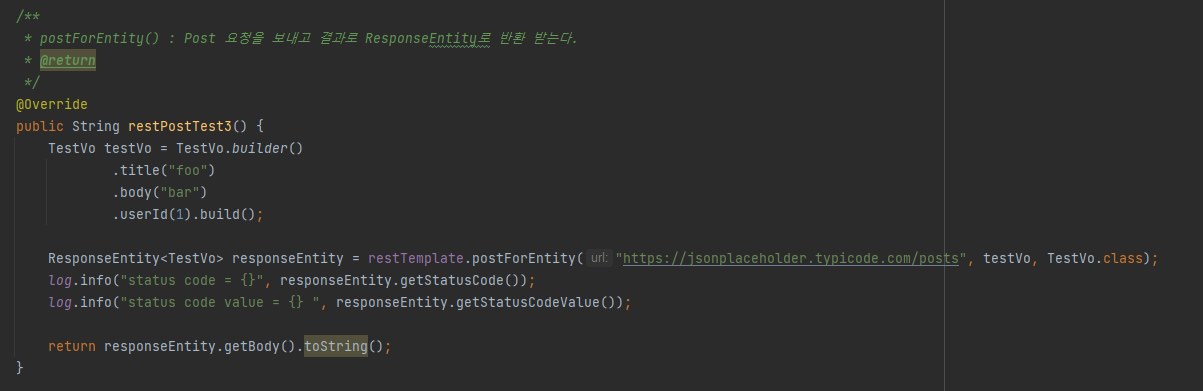 - postForEntity() : POST๋ก ์์ฒญ์ ๋ณด๋ด๊ณ ๊ฒฐ๊ณผ๋ก ResponseEntity๋ก ๋ฐํ ๋ฐ๋๋ค.