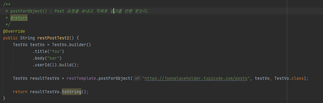 - postForObject() : POST๋ก ์์ฒญ์ ๋ณด๋ด๊ณ ๊ฐ์ฒด๋ก ๊ฒฐ๊ณผ๋ฅผ ๋ฐํ ๋ฐ๋๋ค.