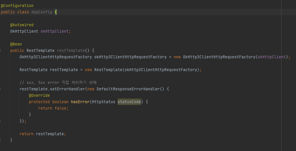 -> restTemplate.setErrorHandller์์ return false๋ก ํด์ค์ผ 4xx, 5xx ์๋ฌ๋ฅผ ์ง์ ์ฒ๋ฆฌํ ์ ์๋ค.
