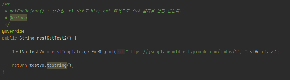 - getForObject() : ์ฃผ์ด์ง URL ์ฃผ์๋ก HTTP GET ๋ฉ์๋๋ก ๊ฐ์ฒด์ ๊ฒฐ๊ณผ๋ฅผ ๋ฐํ ๋ฐ๋๋ค.